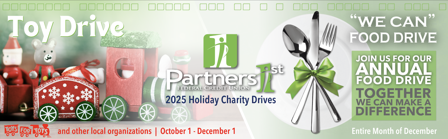This year, we are partnering with Toys for Tots and other organizations to collect new, unwrapped toys for deserving underprivileged children in our communities. Beginning in October, drop off bins will be at every Partners 1st branch. Start your holiday shopping early, and bring in toys that children will love to have wrapped under their Christmas tree this year. You can donate toys until Monday, December 1.